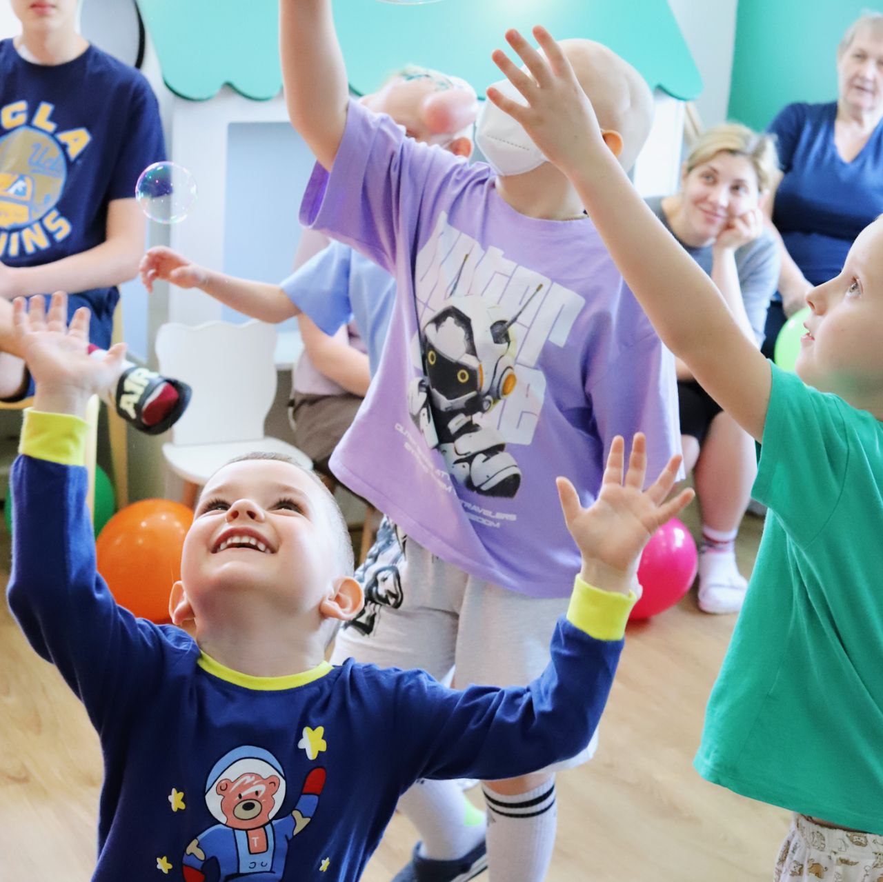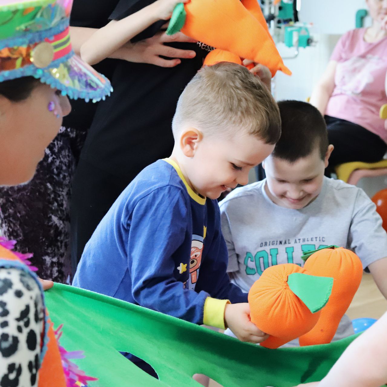 Ребята с нетерпением ждали гостей, и отделение сразу наполнилось музыкой, воздушными шарами и детским смехом! Малыши сразу включились в веселые игры, а ребята постарше сначала сохраняли серьезность, но и они не устояли перед обаянием аниматора Ирины.